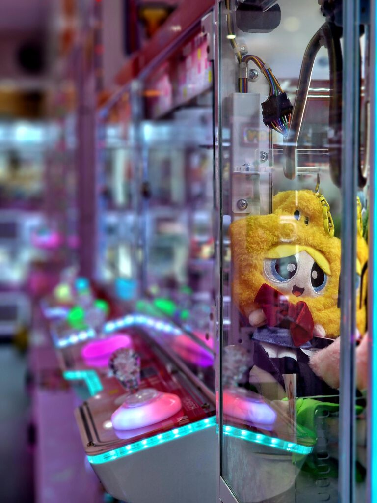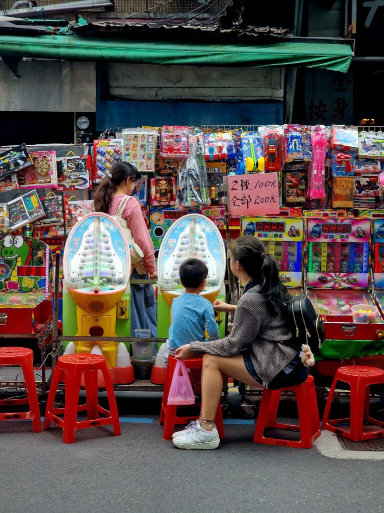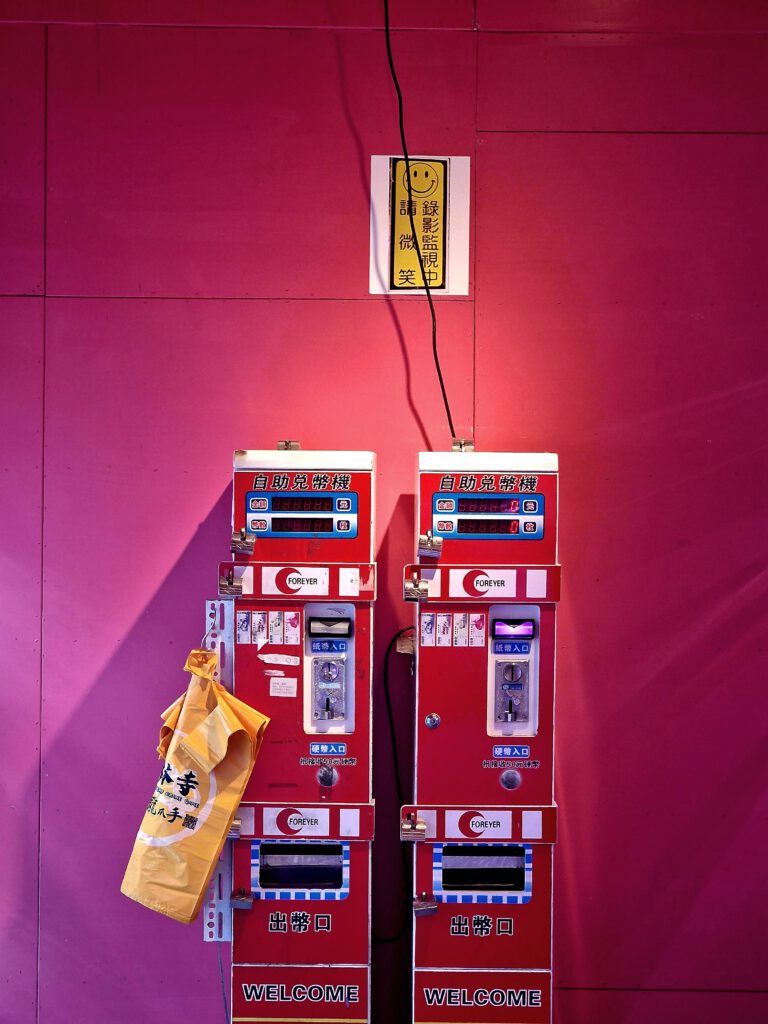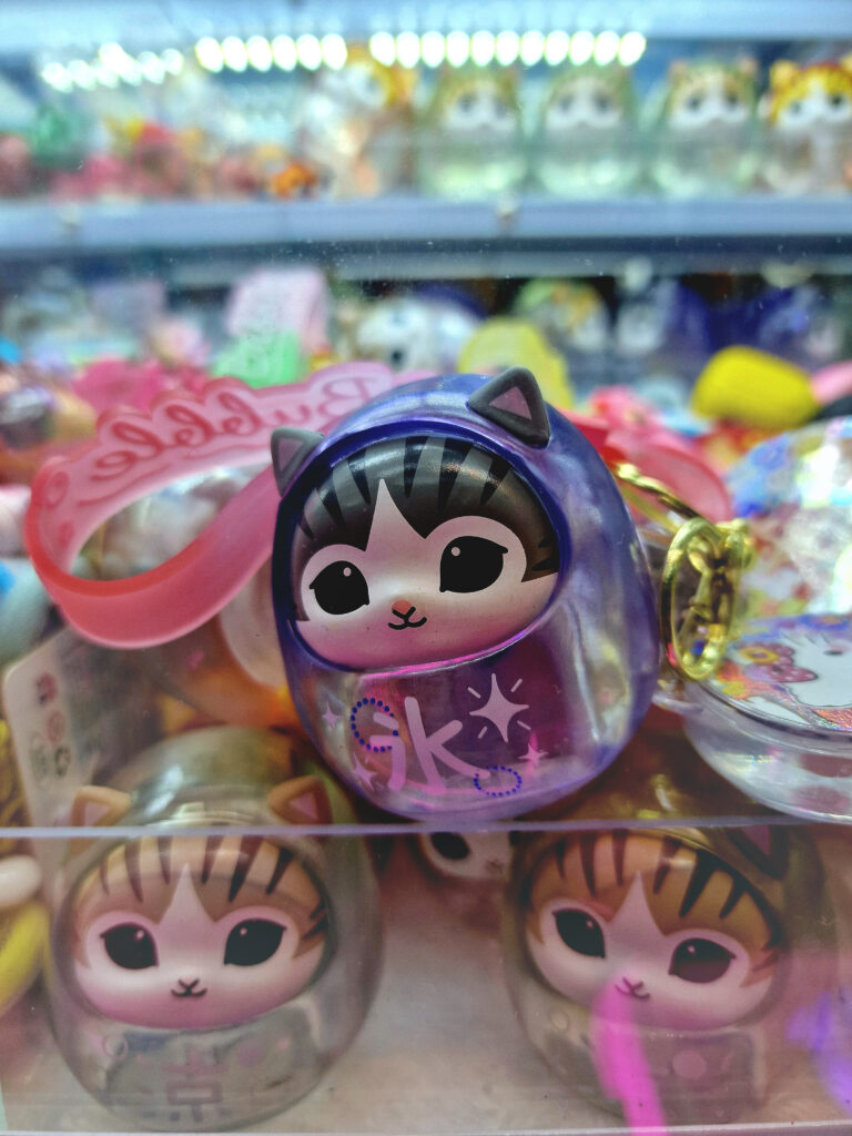 You drop a coin into the machine and wait. A short pause, a mechanical click, then a capsule falls out. Behind the glass: a crowded mix of bright, garish, nostalgic figures—some cute, some slightly unsettling—set against a worn, unglamorous backdrop. It’s tempting to call this “kitsch,” but that label doesn’t quite fit. In East Asia — where these images were taken — such colorful displays are part of everyday culture; dismissing them as kitsch would be elitist and ethnocentric. Shaped by kawaii aesthetics, they bring small moments of lightness and distraction.